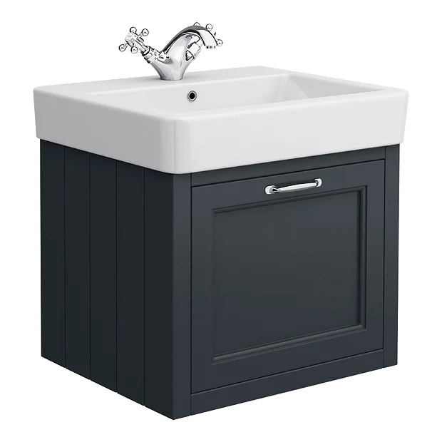 The Chatsworth traditional 560mm wide wall hung satin graphite vanity unit with gloss white ceramic basin, Victorian inspired design with a modern twist. The Chatsworth range of charming bathroom furniture features classic styling with a satin graphite finish cabinet and tongue-and-groove side panelling.